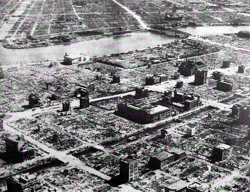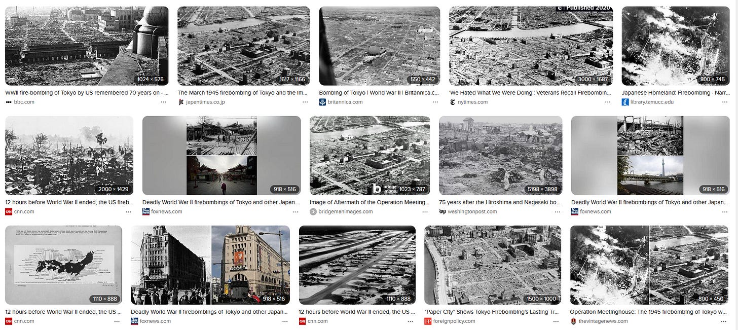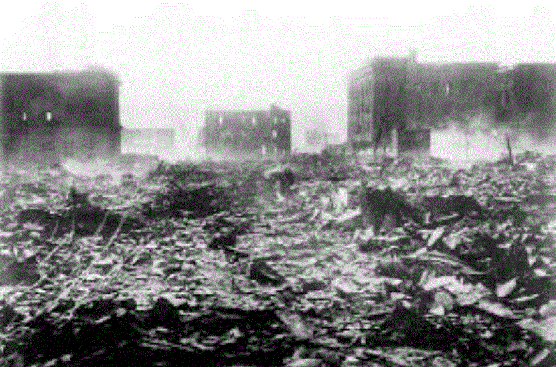 Notice the destruction of wooden building keeps going for miles with no letting up. Even a nuke would show less damage with increasing distance, so it must have been carpet bombed. Do you know the song, Magic Carpet Ride?