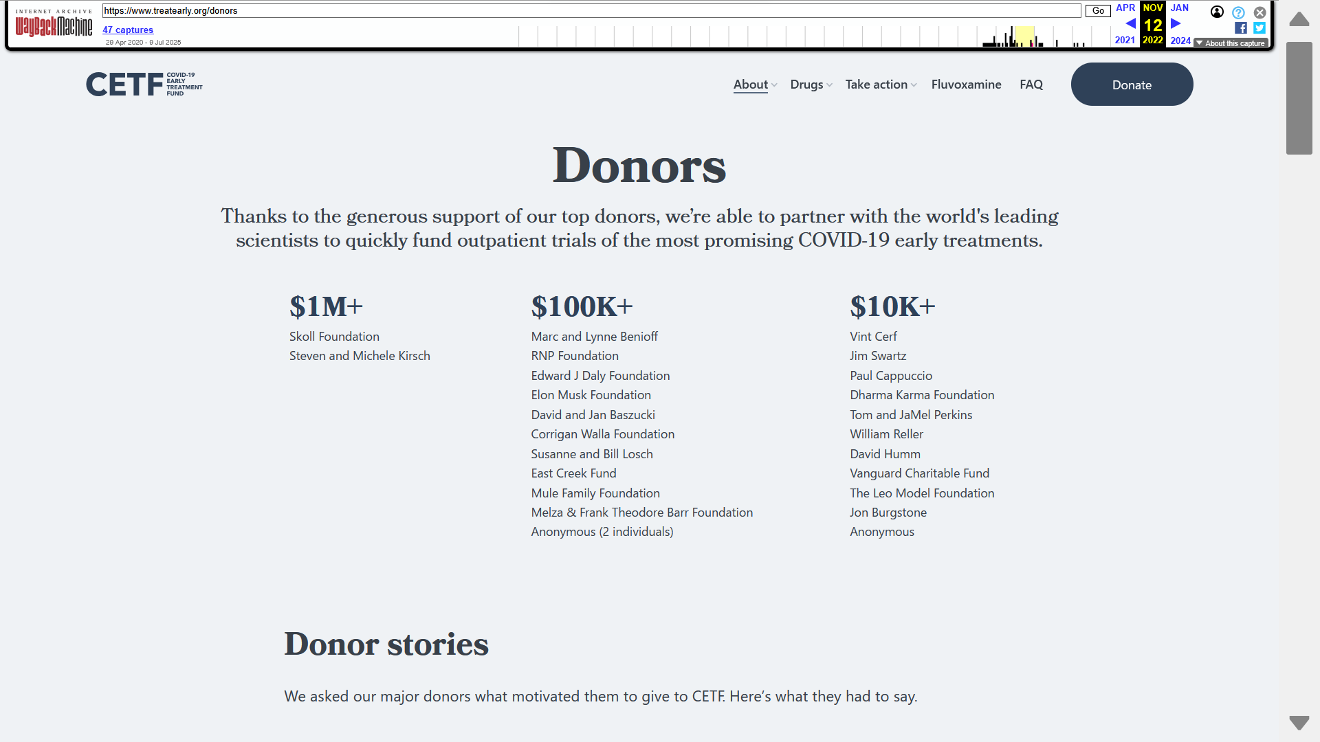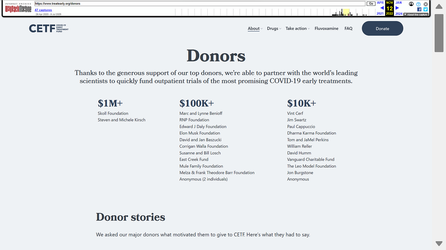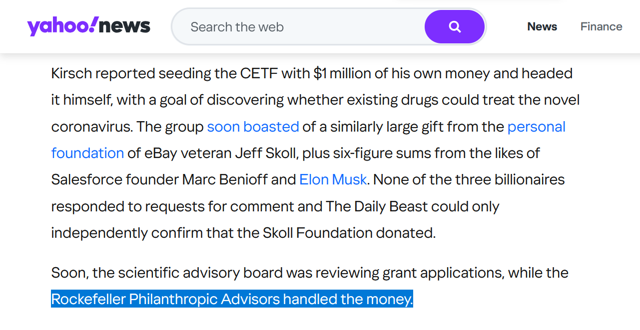 Kirsch’s fund, the (CETF) COVID-19 Early Treatment Fund was administered by the Rockefeller Philanthropy Advisors and has a few famous Globalist donors like: Elon Musk Foundation, Vanguard Charitable Fund, etc.